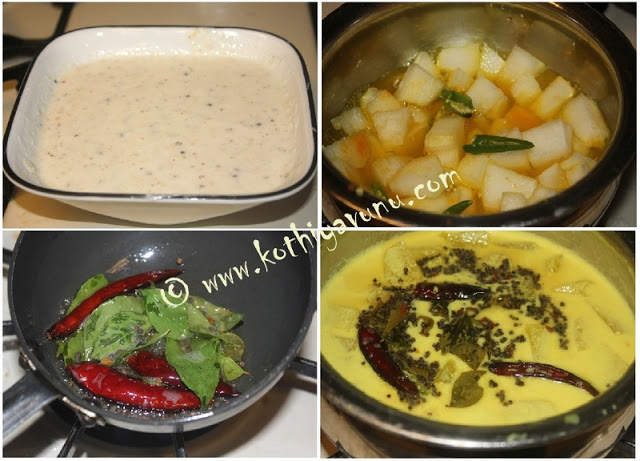 3. Once the ashgourd /kumbalanga is cooked well add the coconut and curd paste to this and keep it in low flame ; Bring the curry- just to a boil and immediately turn off the stove. (Note : Take care not over boil the curry.)